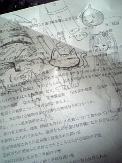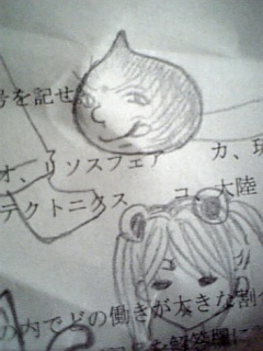 とりあえず、期末テスト3日目終了よッ★☆ いっやぁ~… 今まで以上のやる気のないテストだったわん。 昨日は、寝る前にちょーっと数学やったくらいで… まぁ、 そのちょっとは 何の役にも立たなかったけどね… ((早く寝りゃぁよかった。 テスト予想以上に早く終わったから ((15分で終了いたした。 変な落書き描いちゃったし。 ちなみに、オススメは コチラ。 スライムさんです。 きゃ~!!カッコいいッ!!きゃーッ ………なんか、キモくて 人にも見せられなかったわ… 実際に居そうだし… ちなみに、スライムの下はセーラーむーん。 頭に2個饅頭みたいなののってるけども。 てか、セーラームーンって何歳だったっけか…?? |