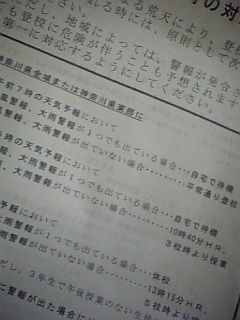…てことは…学校休み!!!!??? って思ってたら、7時になっても神奈川県東部に 警報がでない!!!! とりあえず、しぶしぶ学校行ったら 思ったとぉり、全然クラスに人居ないし… なんちゅうガッコじゃ。 (最近雨が降るたびに、 学校休みかとカン違いしてしまう… ((うちだけじゃなく、多分全校生徒が…) それでも、1時には警報が出たために 臨時休校☆★ やったぁぁにゃぁぁぁ!!! でも、外出たとたん友達の傘が一発で 大破☆★ はずかし~。ってか、うちずっとワラってたけどね…ごめんにょ… こんな感じのが、道端にいっぱいあってウケた。 仲間いっぱいよ~★ そしていつものよぉーに サイゼへ…うんきょにゃん、おごってくれてありがちょ☆ でも、頼んだ物がなんか 超気持ち悪くなるやつで、結局最後まで食べたれんかった… ので、人にあげて ずっと人の食ってた。 リゾット系美味いなぁ… 帰る途中、人が傘折ったのを笑った天罰か知らんが、 むつみの傘も大破!!!! 自分の傘が大破して、悲しむどころか 待ってましたのごとく写メをとるむつみ… 災難はこれだけにとどまらず、 なんだか指先の感覚が変だな~ とか思いながら歩いていた。 ふと、カーデの袖を見ると絵の具…? こんなに美術の時、絵の具つけちゃってたんだ? とか思ってよく見ると、 右手の薬指の先から大量出血!!!! ぎゃー!!!!??? って思いながらも、指先は何の痛みもなく 血が地面にしたたるだけで、傷口がどこかもよく解らない。 悲しかったのは、お気に入りのカーデが血まみれになってしまった事…。 袖の中まで血まみれで、関係ない左腕にもついてた… とりあーえず、友達のバイト先で応急処置してもらったら 指の先の肉がえぐれてた…((汗;汗 傘が壊れたときに、一緒に切れたっぽい… ガッチリ☆ガードされたバンドエイド 取るの恐いな~。 えぐれた部分とどう接していいのか分からないワ!!!! |
